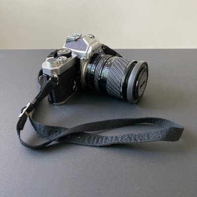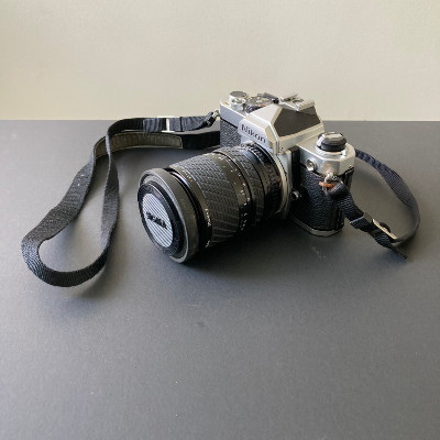 Vintage Nikon FM film camera (Serial number: 3474676) with a Sigma 28-70mm (1:3.5~4.5) lens. Includes a camera strap and lens cap.